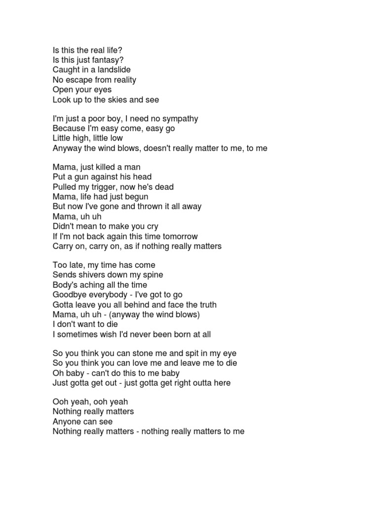 Is this the real life? Nothing really matters, anyone can see nothing really matters nothing really matters to me. Thunderbolt and lightning, very, very frightening me. G d adim a7 d any way the wind blows. Cm abm nothing really matters, fm7/bb nothing really matters eb a/eb eb ebdi7 to me. Any way the wind blows. A guitar accompanies the chorus. outro (ooh) (ooh, yeah, ooh, yeah) nothing really matters, anyone can see nothing really matters nothing really matters to me any way the wind blows. Nothing really matters, anyone can see, nothing really matters, nothing really matters to me. Cdim g bbmaj7 a gdim a d. Nothing really matters anyone can see nothing really matters nothing really matters to me. Nothing really matters, anyone can see If you really listen to it, the ballad starts off clean, and as the opera section gets louder and louder see media help.